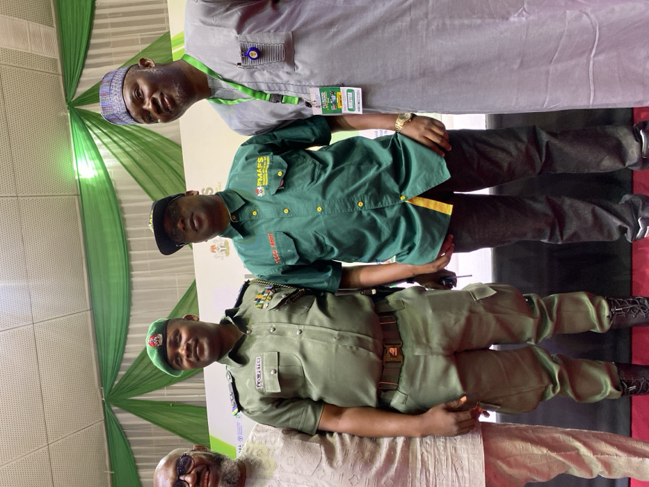 Four adult males are standing side-by-side on a red carpet in an indoor setting, posing for a photograph at a location in Unguwar Sarki, Nigeria. The backdrop features green and white draped fabric, with a white panel displaying the Nigerian coat of arms, the "FMAFS" logo, and other text, suggesting an event related to the Federal Ministry of Agriculture and Food Security. From left to right: 1. A male with a bald head, grey beard, and eyeglasses is wearing a light-colored, possibly off-white, traditional long-sleeved top and matching trousers. He is smiling. 2. A dark-skinned male in an olive green short-sleeved military or paramilitary uniform, including a beret with a badge, cargo pants, and black combat boots. His name tag reads "A.O. PETER." Several medals or ribbons are affixed to his left chest. Handcuffs are visible on his right hip. He is smiling. 3. A dark-skinned male wearing a black baseball cap and eyeglasses. He has on a dark green short-sleeved collared shirt with yellow buttons and yellow lining inside the placket. The left chest pocket displays "GOD FIRST" embroidery, while the right chest features the "FMAFS" logo with "FEDERAL MINISTRY OF AGRICULTURE AND FOOD SECURITY" text. He is wearing dark trousers and dark shoes, and holds a dark object in his left hand. 4. A dark-skinned male with a short beard, wearing a grey traditional kaftan-style top with embroidery, a multi-colored cap, and a gold watch on his left wrist. He has a green lanyard with an ID badge, partially obscured, but "DIRECTOR" is visible, and a circular blue and white badge on his left chest pocket. He is smiling.