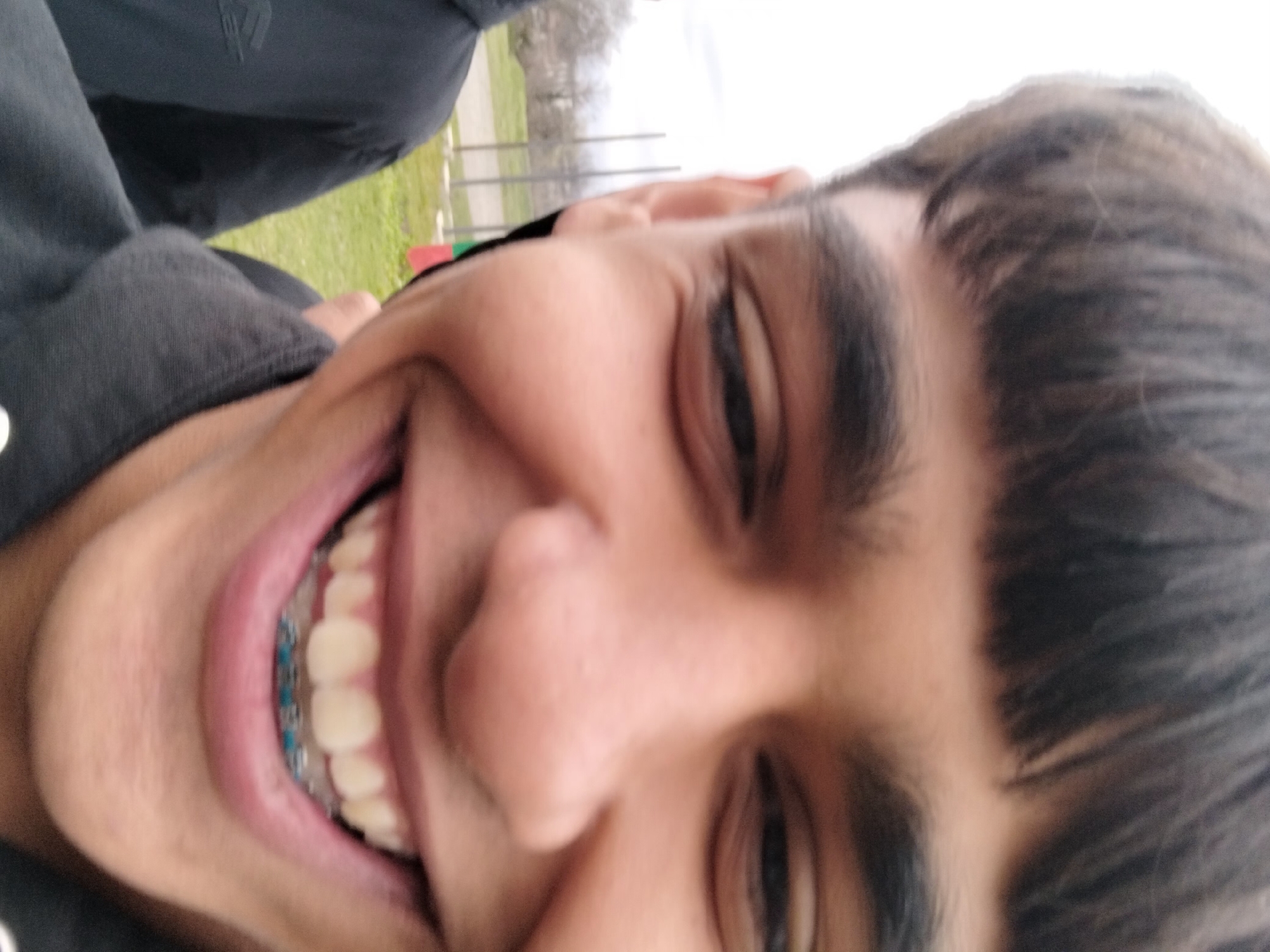 A close-up, front-facing image depicts a young male individual smiling broadly, positioned slightly off-center to the right. He has dark, straight hair with bangs, prominent dark eyebrows, and a light-to-medium skin tone. His mouth is open, revealing visible white teeth and orthodontic braces with blue elastic bands on the upper dental arch. He is wearing a dark-colored, possibly hooded, garment. A second individual is partially visible on the far left, wearing a dark jacket with a dark emblem on the left chest area. The background, largely out of focus, shows an outdoor public environment in Stara Zagora, Bulgaria, under an overcast sky. Visible elements include a green grassy area, a light-colored path or track, and at least three vertical metal flagpoles. A section of a flag displaying vertical red and green stripes is visible near the base of one flagpole. Distant, bare trees and indistinct urban structures are discernible in the far background, suggesting a park, school grounds, or sports complex within the city.