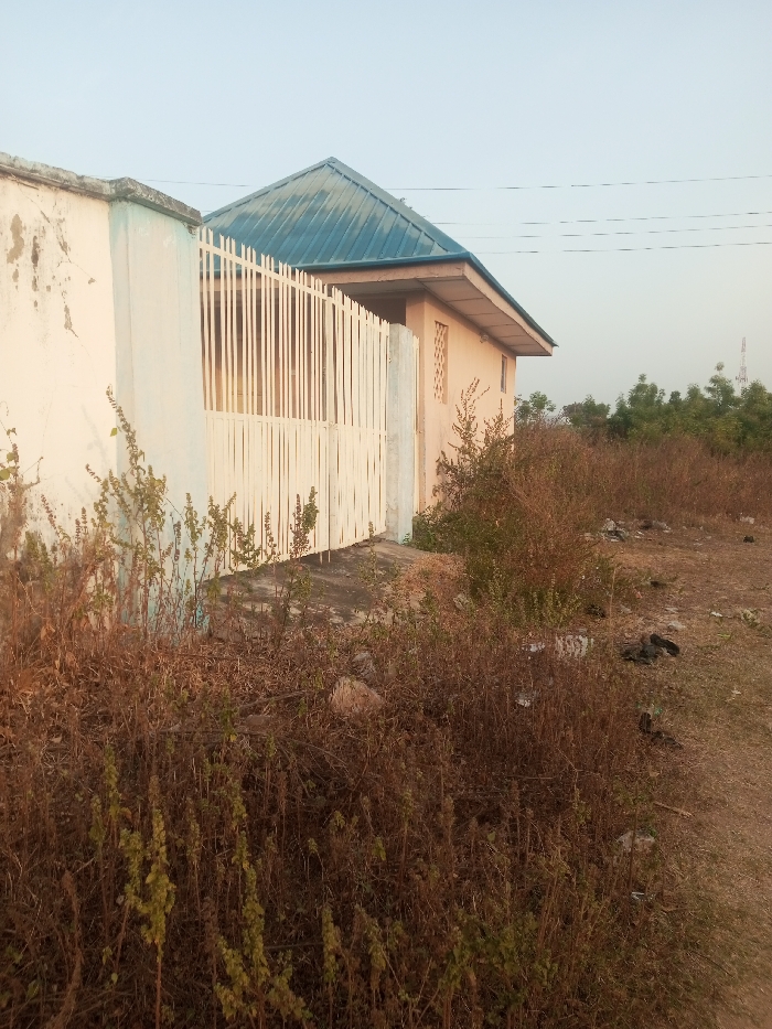 The scene depicts an exterior view of a residential or commercial building in Okeni, Nigeria, viewed from ground level. In the foreground, dry, overgrown vegetation, primarily brown and desiccated, dominates the lower half of the frame, with some greener growth interspersed. To the right, a bare dirt path or unpaved area is visible, containing scattered dark debris, possibly plastic bags. The main structure, positioned slightly off-center to the right, features light peach-colored exterior walls and a distinct teal or blue-green corrugated metal roof with an overhang. A small, rectangular vent or cutout is visible on one side of the building. Adjacent to the building on the left is a pale, off-white concrete wall exhibiting some staining and weathering. A section of a light-colored vertical slatted metal fence or gate extends from this wall towards the building, appearing partially recessed. A concrete slab forms an entrance pad behind this fence section. The sky above is a pale, clear blue. In the distant background, to the right of the building, a cluster of green trees is visible, along with a metallic lattice-structured communications tower. Faint horizontal lines, consistent with overhead power lines, traverse the sky in the upper-middle portion of the image. No individuals or active interactions are present in the scene.