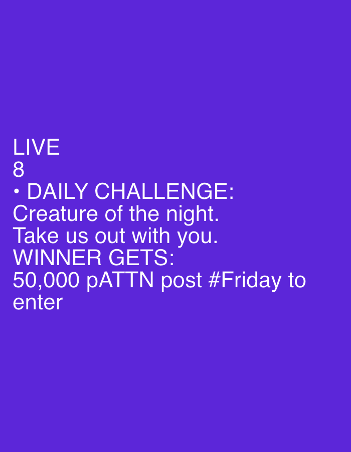This digital graphic, described as being situated in the city of Galaosiyo, Uzbekistan, features a uniform, solid violet background. White sans-serif text is arranged vertically, left-aligned, presenting an online challenge and associated prize information. The text reads: "LIVE", "8", "• DAILY CHALLENGE:", "Creature of the night.", "Take us out with you.", "WINNER GETS:", "50,000 pATTN post #Friday to", "enter". No individuals, physical objects, or specific environmental settings beyond the text and colored background are visually depicted.