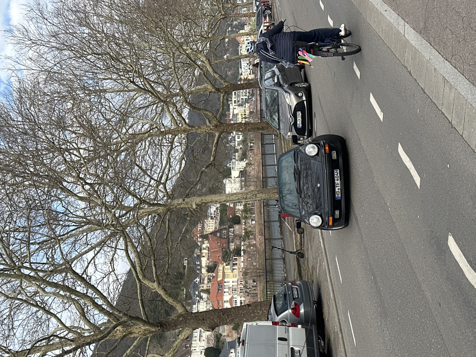 street in Heidelberg, Germany (latitude: 49.412, longitude: 8.695). A person on a bicycle with a multicolored flag is riding on the right side of the street, which is lined with bare trees. A black Porsche 911 (license plate HD TF 404H) is parked in the middle of the street. A silver Toyota Yaris (license plate G-EU 1320) is parked on the right side of the street, with a white van (license plate G-EU 1197) and a grey car parked behind it. In the background, there are many buildings on a hillside. The scene is an urban street with parked cars, a cyclist, and buildings in the background. The weather is cloudy and the sky is overcast.