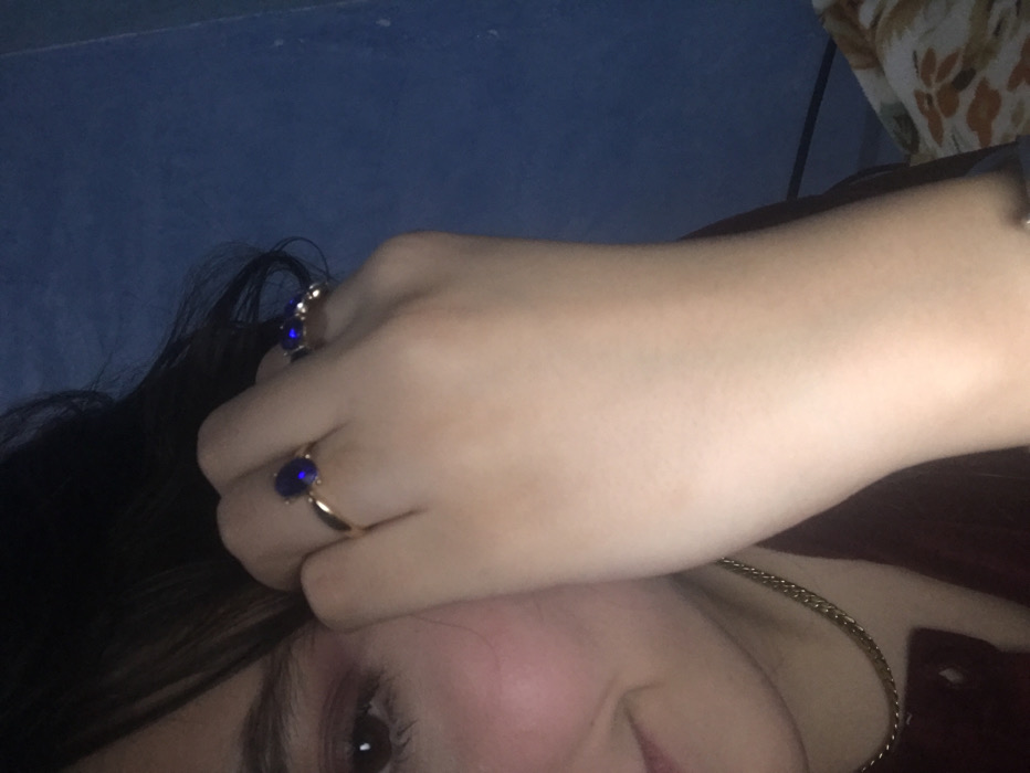 A person rests their head on their hand, adorned with two gold rings featuring oval blue stones. The view is tilted, capturing one eye, part of the nose, and the smile. A gold chain is visible around the neck. Black hair is near the hand, and a blue surface is in the background. The lighting creates a blue hue, emphasizing the rings' stones.