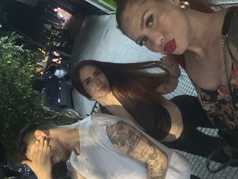 Three individuals are in a selfie. The woman at the top has red lipstick and a floral top. The woman in the middle has long brown hair and a black top. The man at the bottom has tattoos on his arm and is covering his face. The background appears to be outdoors at night, with trees and buildings visible.