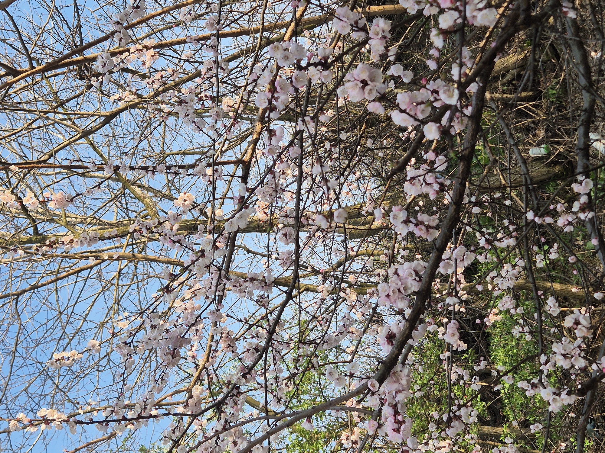 tree with pink and white blossoms against a blue sky