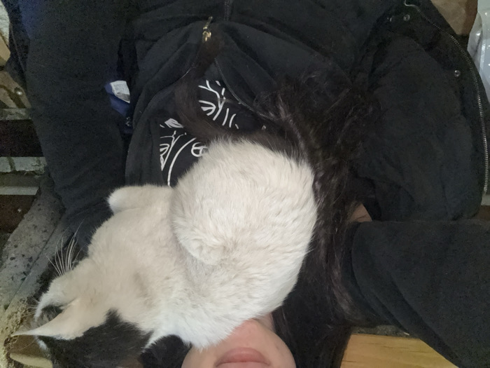 In Velingrad, Bulgaria, a bicolored cat is observed resting on the chest of a human subject. The human's lower face, exhibiting a slight smile, and upper torso are visible. The individual has long, dark hair and wears a dark-colored, possibly black, hooded jacket with a gold-colored zipper pull partially visible. Beneath the jacket, a darker garment featuring white linear designs or text is discernable. The cat, primarily white with black markings on its head and a black tail, is curled on the human's chest, facing towards the right side of the frame. Its fur appears somewhat disheveled. The background is largely out of focus, indicating an indistinct indoor or sheltered outdoor environment with subdued lighting.