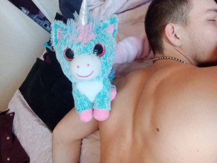 The scene depicts an indoor domestic environment, likely a bedroom, characterized by bedding and personal items. The specific geographical location in Pazardzhik, Bulgaria, is not discernible from the visual elements within the image. A male individual, with short dark hair and light stubble, is positioned in the foreground, lying on his right side or back. His upper torso is bare, revealing skin with a light tan. A silver-colored chain necklace with interlocking links is visible around his neck. His eyes appear closed. Resting on the upper part of the individual's right arm, near the shoulder, is a plush unicorn toy. The toy is predominantly light blue with a white belly, pink hooves, pink inner ears, and a pink mane. It features a silver, textured horn and large, dark, reflective eyes. A red-embroidered smile is present on its white snout. A light pink and white striped tail extends behind it. The bedding beneath the individual and the unicorn is a light, possibly pinkish or off-white, textured fabric. In the background, dark-colored clothing items and other personal effects are partially visible, suggesting a cluttered domestic setting. Natural light appears to illuminate the scene from an unseen source to the left.