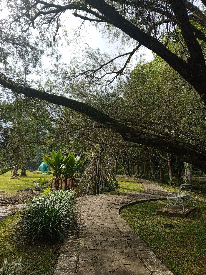 A winding stone path curves through a verdant park. Lush green grass borders the path, interspersed with trees and foliage. A white wrought-iron bench sits beside the path, inviting rest. A teepee structure and exotic plants add interest, while a distant blue dinosaur statue provides a whimsical touch. Overhanging branches frame the scene, creating a tranquil and shaded atmosphere.