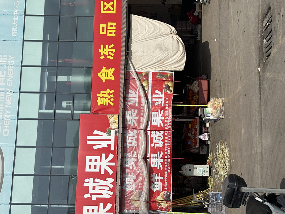 The image depicts an outdoor commercial scene in Licheng District, Jinan, China