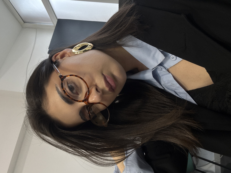 A close-up, eye-level indoor shot depicts a female subject in Yerevan, Armenia. The subject has long, dark brown hair and is wearing tortoiseshell-patterned oval eyeglasses. Her gaze is directed straight at the camera with a neutral expression. She is adorned with a large, irregular gold-colored oval hoop earring on her visible right ear. Her attire includes a light blue collared shirt, partially unbuttoned, layered over a black v-neck top, possibly lace-trimmed, and a black blazer. The background consists of a plain light-colored wall, with a partial vertical white frame element visible on the right side and a dark, indistinct object on the far left.
