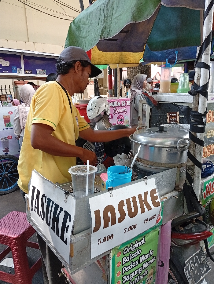 A street vendor wearing a yellow shirt and a grey cap prepares "Jasuke", a steamed corn snack