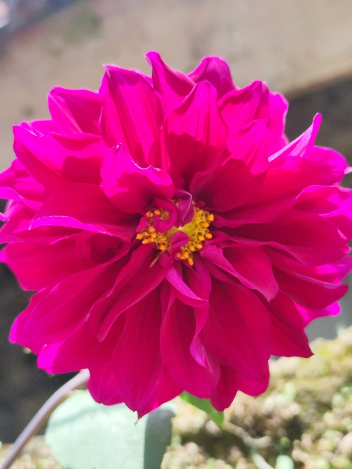 The image displays a single, vibrant fuchsia or magenta flower, centrally positioned and in sharp focus. The flower exhibits numerous densely packed, overlapping petals, creating a full, rounded appearance. At its core, a cluster of small, bright yellow reproductive structures is visible. Strong natural light illuminates the flower, creating highlights on the petal surfaces and subtle shadows between layers. The background is significantly blurred, indicating a shallow depth of field, and features indistinct shapes and muted colors, including green foliage and lighter tones, suggesting an outdoor setting. A thin, curved stem is partially visible in the lower-left corner, supporting the flower. The specific location within the city of Charleroi, Belgium, cannot be determined from the visual information provided.