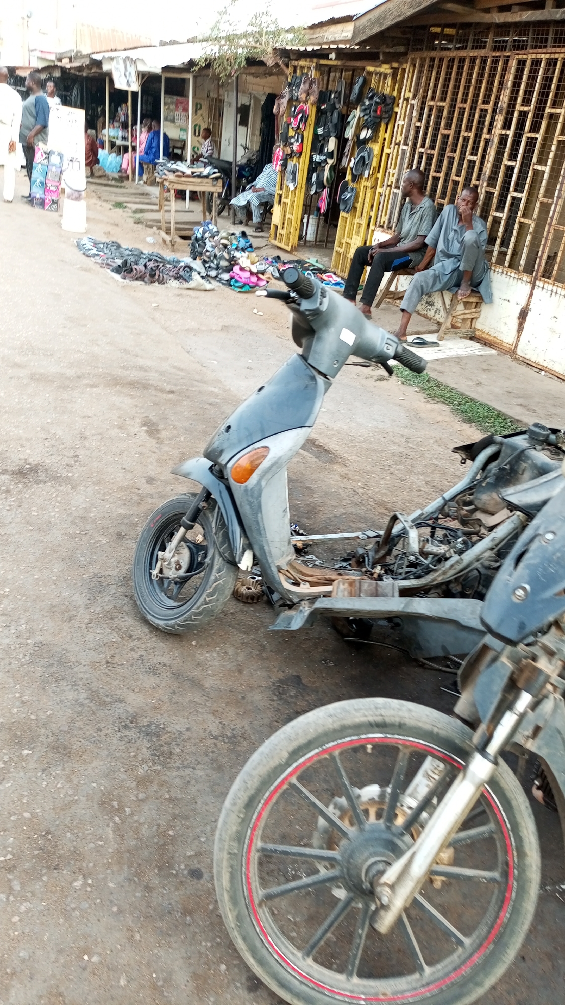 The scene depicts a roadside setting in Unguwar Shanu, Nigeria. In the foreground are two damaged scooters, both missing components and appearing in a state of disrepair. Behind them, a row of informal shops is visible. One shop displays numerous pairs of shoes and sandals for sale on the ground. Two men are sitting in front of the shops. People are moving and sitting around the shops.