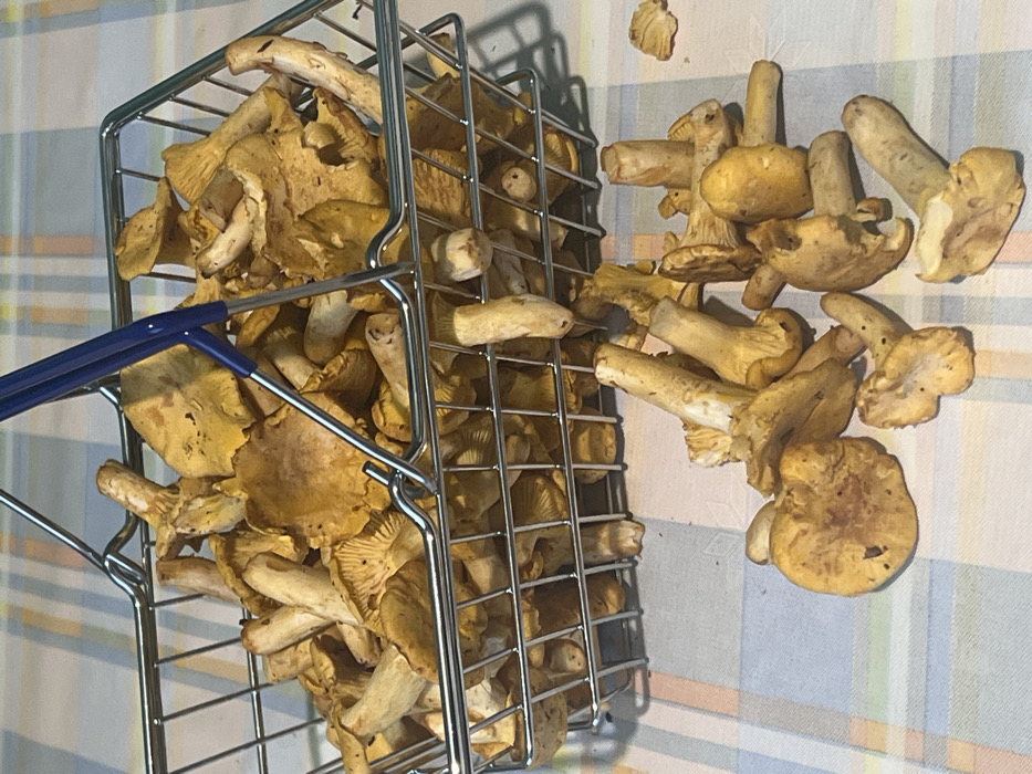 The image displays an indoor scene featuring a substantial quantity of chanterelle mushrooms