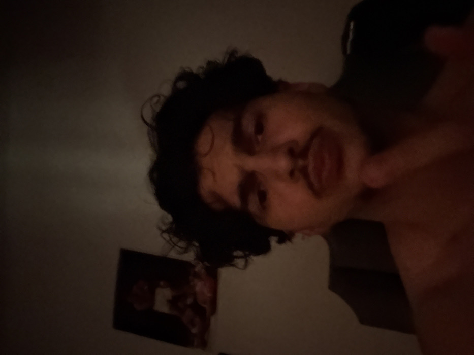An indoor scene, dimly lit, features a male individual positioned centrally, looking directly into the camera. The male has dark, curly hair, a mustache, and a short beard. He appears shirtless or partially clothed in a dark garment on his right side. His right index finger is raised, pointing upwards towards his chin. His expression is neutral to slightly pouting. In the upper left background, a framed picture hangs on a light-colored wall; its specific content is indistinct due to the low light. To the immediate left of the subject, a dark, upholstered object is partially visible. The lighting appears to originate from the front, casting soft shadows. There are no identifiable landmarks or distinguishing features within the image to determine a specific location in Strasbourg, France; the setting appears to be a private interior, likely a residence.