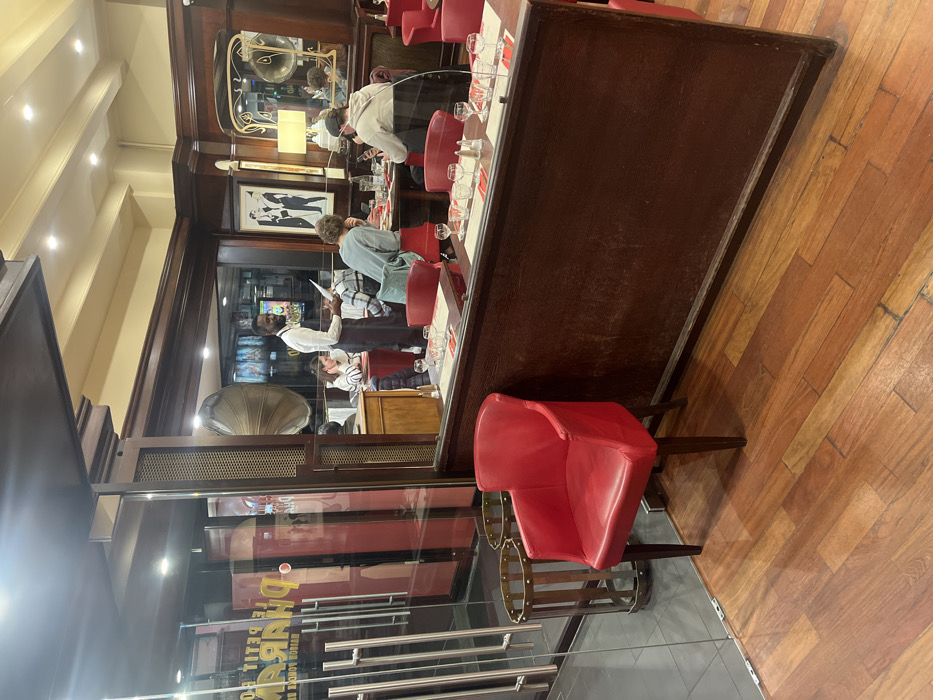 - "A restaurant interior features dark wood furniture, red chairs, and a reflective glass partition" by FM-dohxp1, licensed under CC BY 4.0
