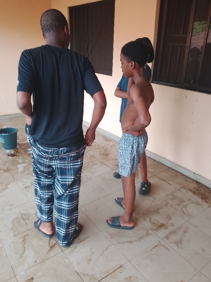 Three individuals stand on a tiled floor in Ufuma, Nigeria, within a light peach-colored structure featuring two dark-framed windows in the background. The light-colored tiled floor displays numerous dark, irregular wet stains. On the left, an adult male, viewed from behind, wears a black short-sleeved t-shirt with a white logo on the left bicep and dark blue plaid pants. He wears dark slides, with his hands positioned in his pockets. A green plastic bucket is partially visible behind his left leg. To his right, a young male stands facing left, shirtless, exhibiting a noticeable abdominal protrusion. He wears light blue plaid shorts, dark slides, and has his right hand on his hip. A thin silver-colored chain is around his neck, and a green clip is visible in his dark hair. Partially obscured behind the shirtless young male is a third individual, wearing a dark blue t-shirt and dark shoes with a star pattern. All individuals are standing in a relaxed posture.