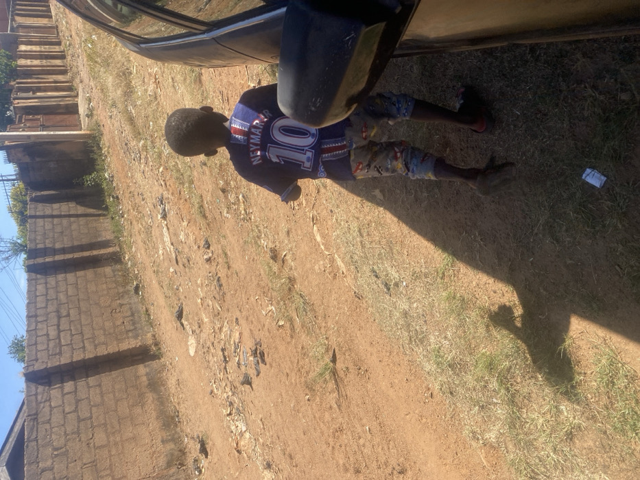 The scene depicts an unpaved, sunlit street or pathway in Jos, Nigeria. A young, dark-skinned male child is viewed from the rear, positioned near the passenger side of a dark-colored vehicle. The child wears a blue football jersey with "NEYMAR JR" and "10" printed in white on the back, patterned long pants, and a dark slide sandal on the left foot, while the right foot is bare. The child's right arm appears to be an amputated limb, ending below the elbow. A prominent shadow of the child extends onto the reddish-brown dirt ground. The car's side mirror and part of its body are visible on the right. In the background, a long, light-brown concrete block wall with vertical support pillars extends across the frame. Beyond the wall, sparse green foliage and a brown metal gate are discernible. The unpaved ground features patches of dry green and yellow grass, along with scattered black plastic debris and other refuse. The sky is clear blue, indicating strong sunlight from an unseen source to the right, casting distinct shadows.