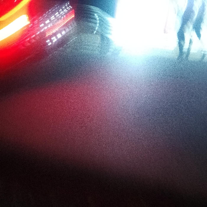 An abstract image presents a dark, grainy foreground transitioning to a lighter, speckled background. On the left, blurred red light streaks suggest movement. To the right, a bright, undefined white area suggests strong illumination, possibly from headlights or artificial sources. A shadowy silhouette can be perceived in the white area. The overall effect is one of low-light conditions and the blur of motion.