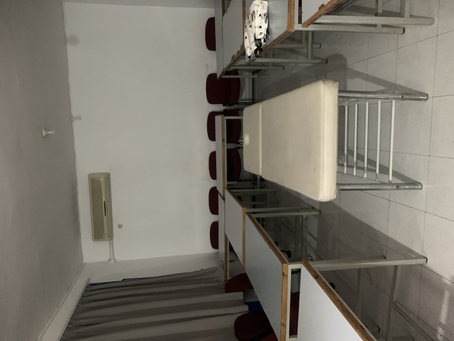 A small room contains rows of desks and chairs. The desks are white with metal frames. Each desk has a dark red chair. A long, white padded medical table stands at the end of one row of desks. A window air conditioning unit is mounted on the wall opposite the desks, above a striped curtain. The floor is covered in a tile pattern. The overall lighting is somewhat dim.