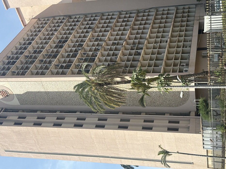 A tall, light-colored building features a distinctive grid-like facade with recessed sections. Below, a patterned section leads to a row of rectangular windows. Palm trees partly obscure the view of the building. A fence and other greenery are seen on the right side of the image. The perspective is angled upwards, emphasizing the height and design of the building.