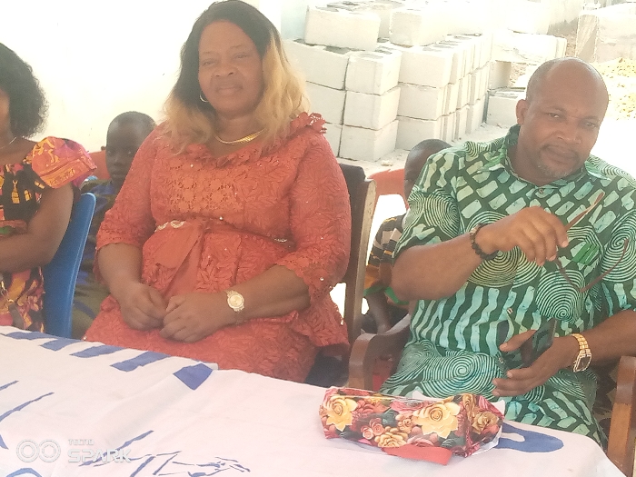 The image depicts two adults seated at a table covered with a white cloth adorned with blue markings. A woman, dressed in a red lace garment and wearing a gold watch and necklace, is seated to the left. A man, wearing a green and white patterned shirt and a gold watch, is seated to the right. In front of the man, a floral-patterned item rests on the table. A stack of white, rectangular blocks is visible in the background. Partially visible behind the woman is another individual in a patterned garment. Two children are partially visible seated behind the adults. The location is Ajaokuta, Nigeria, based on metadata.