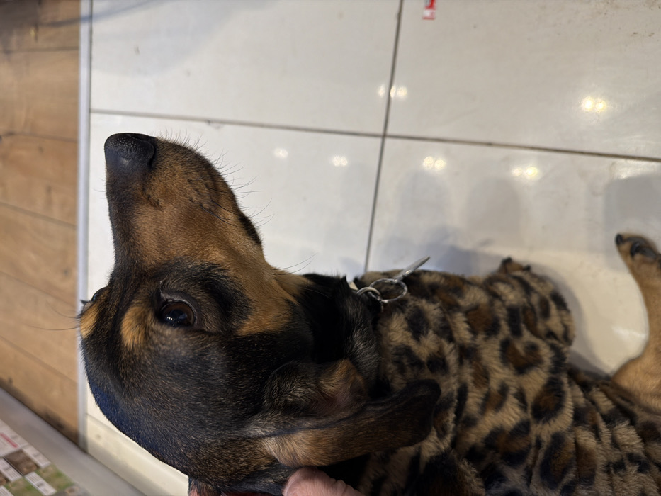 - "An upward-angled, close-up photograph captures a small, short-haired dog, likely a Dachshund mix, exhibiting black and tan fur markings, resting on a tiled floor" by FM-NyWZ82, licensed under CC BY 4.0