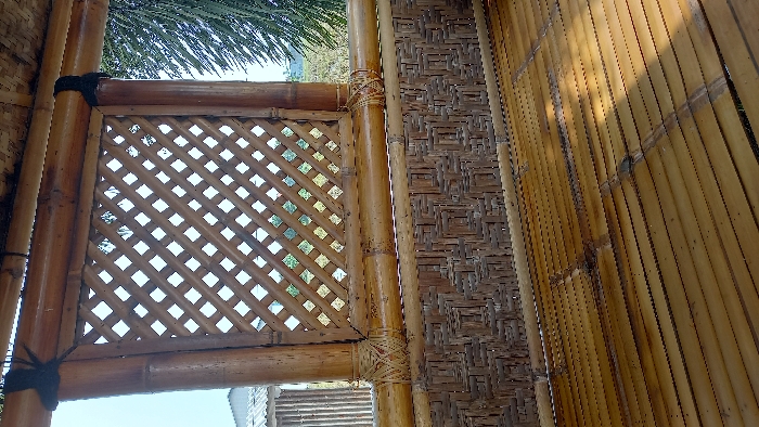 A partially viewed bamboo structure with a lattice panel on the left, featuring a diamond-shaped grid allowing light to pass through