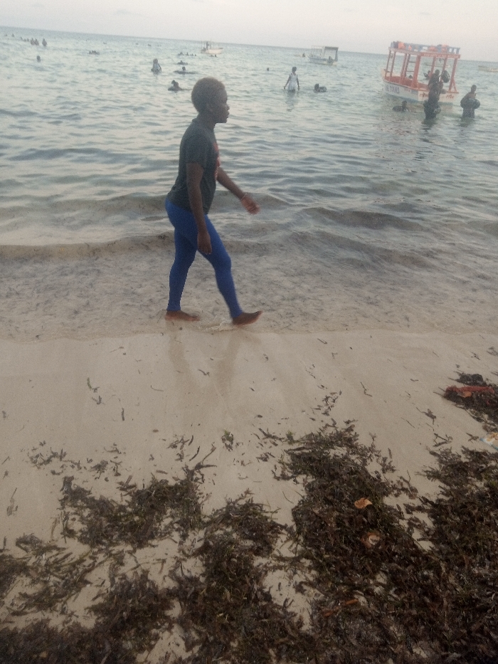 This image captures a beach scene in Shanzu ward, Kenya. In the immediate foreground, a person with short, light-colored hair and dark skin is observed walking barefoot from left to right along the sandy shoreline. They are dressed in a dark t-shirt and blue leggings, with their feet partially submerged in shallow water at the wave line. The sandy beach exhibits varying degrees of wetness, and the lower portion of the frame is covered with extensive deposits of dark green/brown seaweed or marine vegetation. In the background, numerous individuals are present in the ocean water, engaged in swimming and wading activities. Several boats are visible, including a prominent orange and white open-top vessel anchored on the right side of the frame, with multiple people in its vicinity. Additional smaller, light-colored boats are discernible further out in the water. The sky is light and hazy, indicating either an overcast condition or a specific time of day.