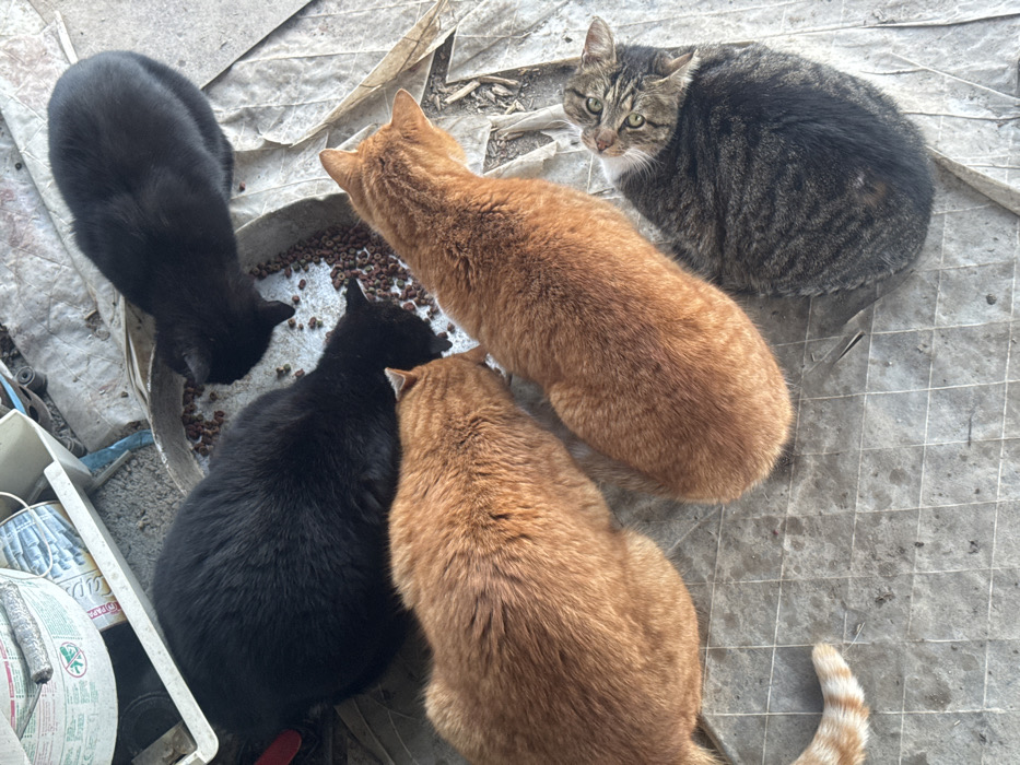 In Bistritsa, Bulgaria, five cats are observed outdoors, gathered around a shallow, round, light-colored bowl filled with brown kibble. Two black cats are positioned with their heads submerged in the bowl, actively consuming food. One orange/ginger cat is also feeding from the bowl, its back to the viewer. Another orange/ginger cat is situated behind the first, oriented towards the bowl, but not visibly eating. A fifth cat, a tabby with a prominent white chest, is positioned to the lower right, looking upwards towards the camera with its head turned. The ground consists of light-colored concrete or tiling, partially covered by dirty, light-toned fabric or plastic sheeting. The immediate background contains indistinct debris and clutter, including what appears to be a light-colored plastic container.