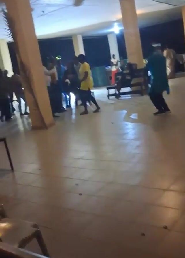group of people gathered on a tiled patio or dance floor, likely at night. Several figures are dancing, with others standing around, observing, or conversing. There are tables and chairs scattered around the space, some with bottles on them. The area is illuminated by overhead lights, and the structure is supported by pillars. The overall impression is that of a casual social gathering or party.