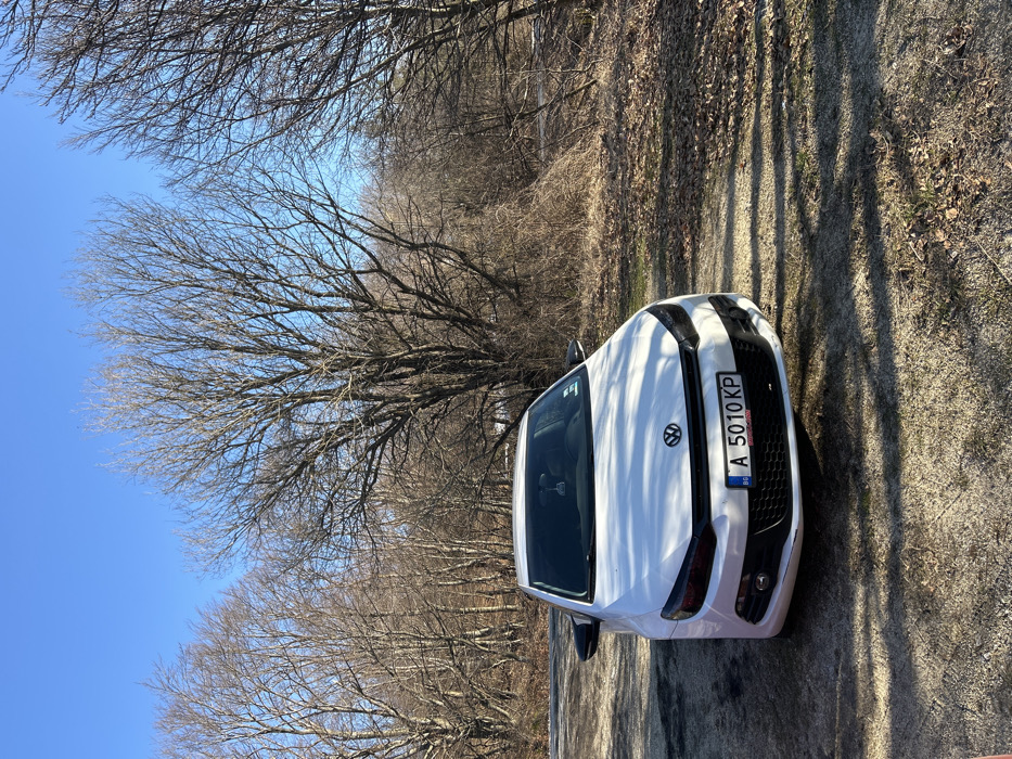 A white two-door Volkswagen Scirocco is parked on an unpaved, dirt and gravel surface with scattered dry leaves and sparse dry vegetation. The vehicle faces the viewer, angled slightly left, and prominently displays a Bulgarian license plate "A 5010 KP" on its front bumper. The headlights feature a dark tint or cover. An object hangs from the interior rearview mirror. Long shadows from unseen objects extend across the ground from the right. The background consists of a dense stand of leafless deciduous trees under a clear blue sky, indicative of a late autumn or winter season. No individuals are present in the scene. The location is Ichera, Bulgaria.