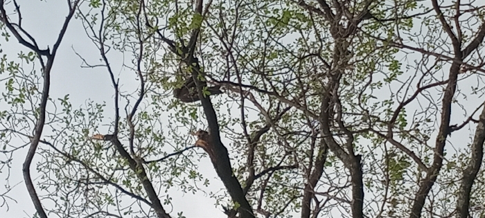 The image captures a dark-plumaged bird, appearing to be a raptor, perched on a thick, horizontal tree branch. The bird is positioned towards the right of the frame, facing slightly right, with its body upright. To the left of the bird on the same branch, a broken section of wood or a natural cavity is visible. Numerous other tree branches, some bare and some adorned with sparse clusters of small, light green leaves, crisscross the foreground and midground. The sky, appearing overcast or light gray, serves as the background. No specific landmarks are visible within the frame to identify a precise location within Kisumu, Kenya; however, the scene depicts an outdoor arboreal environment consistent with such a city. No human subjects or interactions are present.
