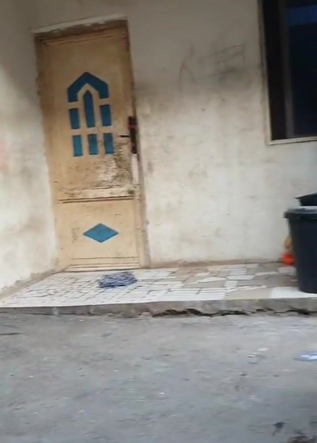 n exterior shot of what appears to be a courtyard or alleyway between buildings. The structures are plain, likely residential, with a concrete slab floor and some exterior objects like crates, a trash can, and a covered well. The buildings have windows and doors, and the paint is somewhat faded. The overall setting seems utilitarian and functional, possibly in a developing country. There are no people or animals visible in the frame.