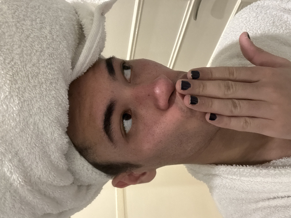 A person with dark hair wrapped in a white towel is looking up and to the left. They have painted nails in a dark color. Their hand is covering half of their face. They appear to be in a bathroom, with a white door in the background. They are wearing a white robe.
