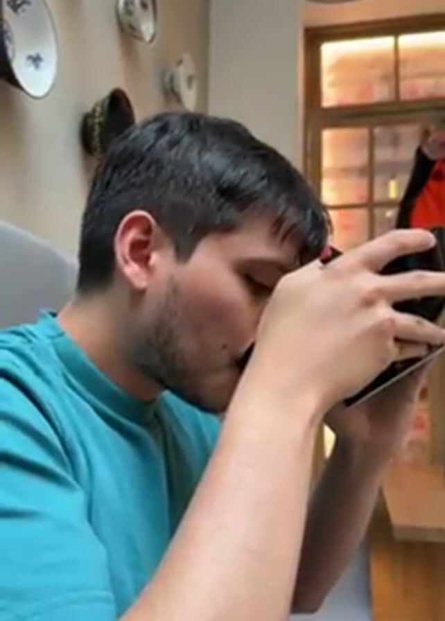 A person is seated indoors, holding a black bowl close to their mouth and tilting it to drink