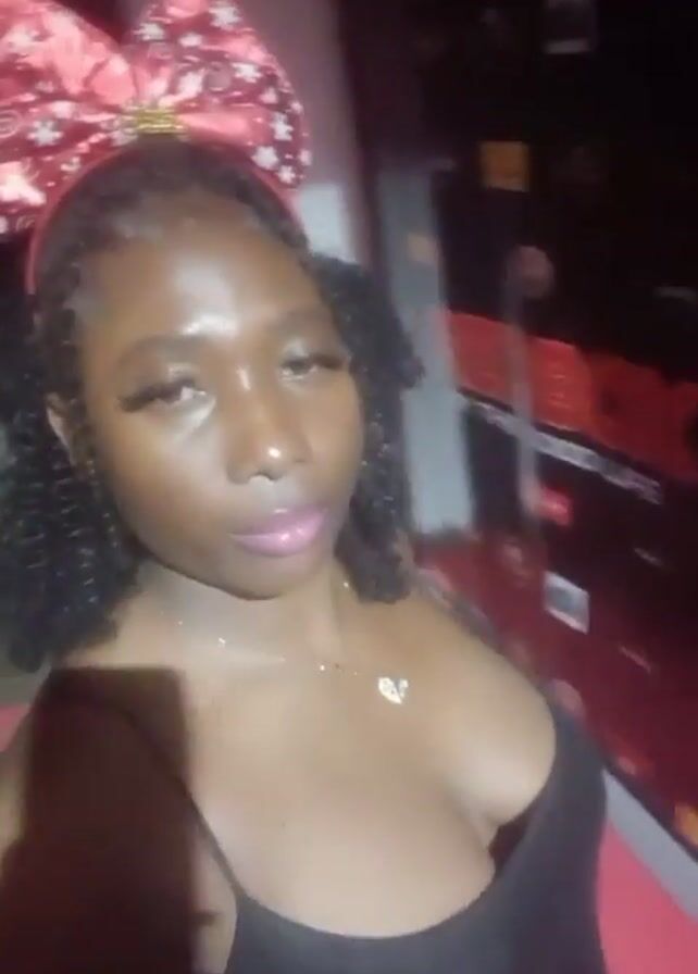 A young woman with dark skin, wearing a black spaghetti strap top, a gold necklace, and a red bow headband, is looking at the camera. Her hair is styled in pigtails. She is standing in front of a dark background with some posters visible. There is a red carpet beneath her.
