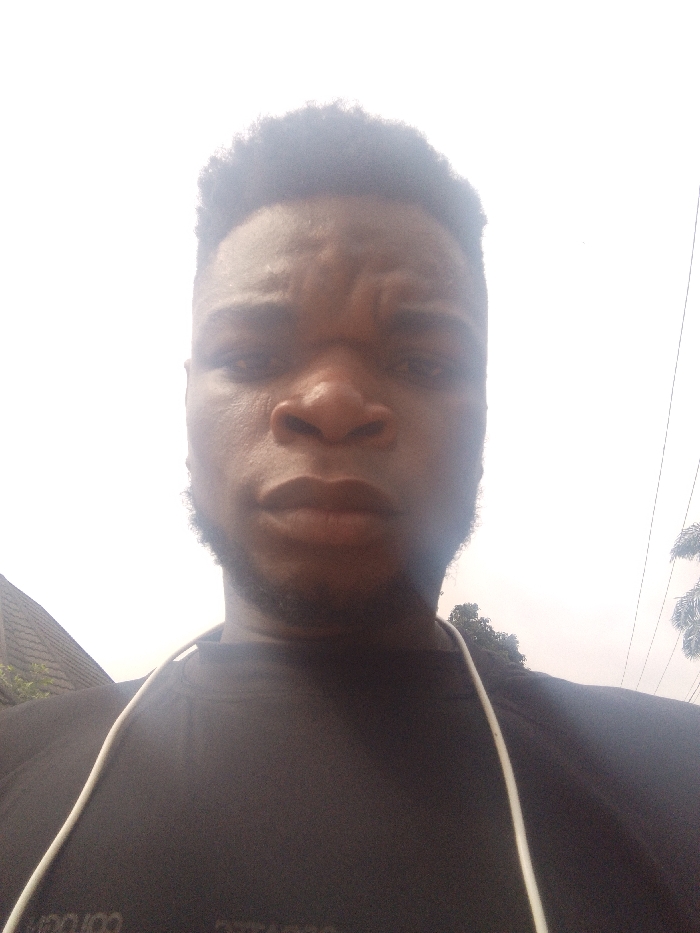 The image displays a close-up, upward-angled selfie of a young adult male, situated outdoors in Agukwu Nri, Nigeria