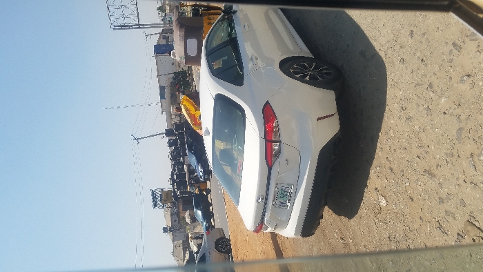 The image depicts an outdoor urban scene in Katambe, Nigeria, under a clear, bright blue sky. In the foreground, a white Toyota Corolla sedan, bearing Nigerian license plate "AWK-595SY," is parked on an unpaved surface composed of light brown dirt and gravel. The vehicle is seen from its rear-three-quarter angle, featuring tinted windows and black multi-spoke alloy wheels. A dark vertical frame element partially obscures the right edge of the photograph. To the left and beyond the white Corolla, a paved road is visible. Several vehicles are present on this road, including a partially visible light-colored sedan on the far left, a dark-colored sedan further back, and a yellow tricycle (auto-rickshaw) with a dark brown canopy, oriented away from the viewer. Another dark vehicle is situated behind the tricycle. The background features low-rise buildings with flat roofs. A significant section of the background is dominated by a large stack of numerous black plastic water tanks, indicating a commercial or storage area. Above these structures, an elevated metal billboard frame with yellow elements and some indistinct text is visible. Multiple utility poles with overhead wires crisscross the sky. A tall, slender white pole or antenna stands against the sky on the far right. No specific individuals are clearly identifiable in the scene.