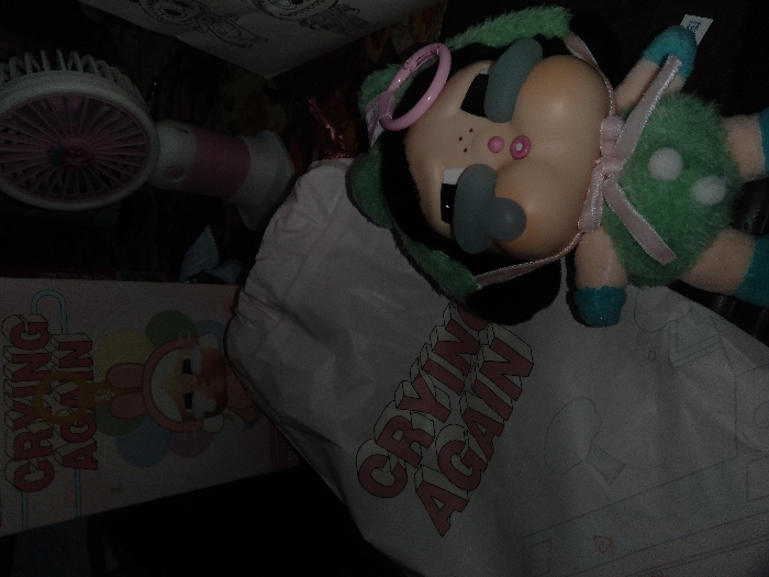 The image displays a static indoor scene in Ciherang, Indonesia, under dim lighting. The central subject is a plush doll, approximately 20-25 cm tall, featuring a light-toned plastic head with black hair and a green furry body. The doll wears a green hood, a green plush suit with white polka dots, blue boots, and blue wrist accents. Its face is characterized by large, grey, tear-shaped elements beneath the eyes and small, pink pursed lips. A pink ribbon is tied around its neck, and a pink plastic ring is attached to the top of its head. To the left and slightly behind the doll, a light pink box or flat item is visible, bearing the prominent pink 3D text "CRYING AGAIN" above a cartoon depiction of a character with a white face, pink bunny ears, and colorful balloons. Partially obscuring the lower section of this item is a crumpled white plastic bag, also printed with the text "CRYING AGAIN" in a similar style. In the background, to the right of the box and behind the bag, stands a small, white and pink portable fan. To the far right, a white object with black line drawings, possibly a print or book page featuring cartoon elements, is partially visible. No human subjects, direct actions, or interactions are depicted.
