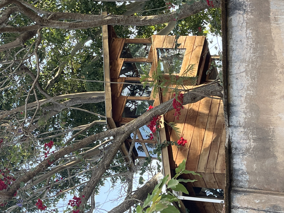A wooden treehouse with multiple windows nestles among branches adorned with red flowers. The structure is boxy, constructed from planks. It's partially shaded by dense foliage. The branches extend toward the left of the frame, while a weathered, light-colored wall or structure is visible on the right edge. The overall impression is a blend of natural and constructed elements.