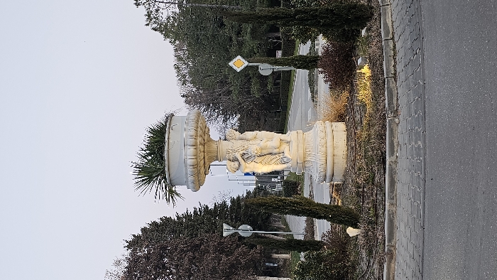 A static, eye-level photograph depicts a prominent, ornate planter situated on a central island within a road intersection in the Sea Garden of Varna, Bulgaria. The planter, constructed from a light-colored material resembling white stone, features a large, fluted bowl at its top, containing a cluster of spiky green plants, possibly Yucca or similar foliage. Below the bowl, the pedestal is sculptured with three cherubic figures (putti) in high relief, positioned around a central pillar-like element. The planter's base is wide and circular, adorned with decorative molding. The ground around the planter on the island consists of sparse, dry vegetation, including grass and low-lying shrubs. Two slender, dark green columnar coniferous trees are planted equidistant from the central planter. Multiple small, ground-level spotlights cast a yellowish illumination onto the lower portion of the sculpture. Asphalt roads are visible on both the left and right sides of the central island, consistent with a roundabout or road division. In the background, extensive tree lines are present. On the left, a dense grouping of tall trees, some appearing deciduous and others evergreen, lines the road. A white triangular road sign with a black vertical line and a circular blue sign with a white arrow are visible on the left side of the road. On the right, further evergreen trees form a backdrop, and a yellow diamond-shaped priority road sign with a white border is prominently displayed. The sky is uniformly light grey, suggesting an overcast condition or diffused daylight. No people or vehicles are present in the scene.