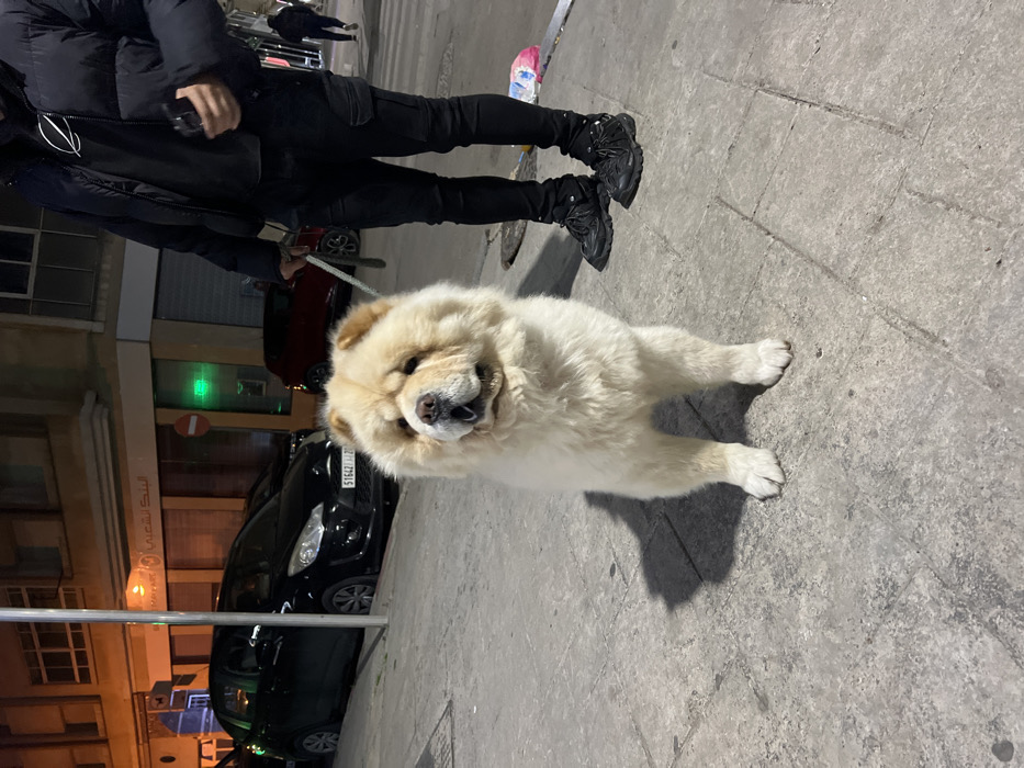 A fluffy, cream-colored Chow Chow stands on a paved sidewalk. It's facing the camera, with its tongue slightly visible. A person in a black jacket and pants holds the dog's leash. In the background, there's a black car parked next to a building with a storefront. The scene is lit by streetlights, casting shadows on the sidewalk.