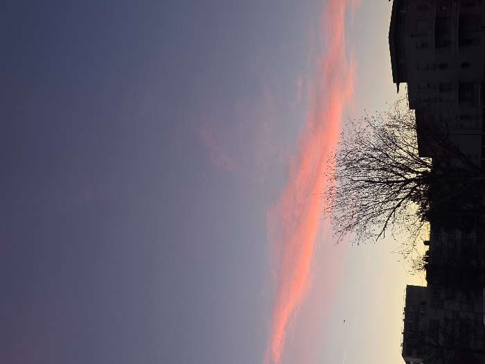 An early evening sky is painted with streaks of pink clouds, contrasting against a backdrop of deepening blue and violet hues. A silhouetted tree, bare of leaves, sits next to buildings. The buildings are arranged in steps, with smaller buildings further away and taller buildings closest. The sky is brighter towards the bottom of the frame.
