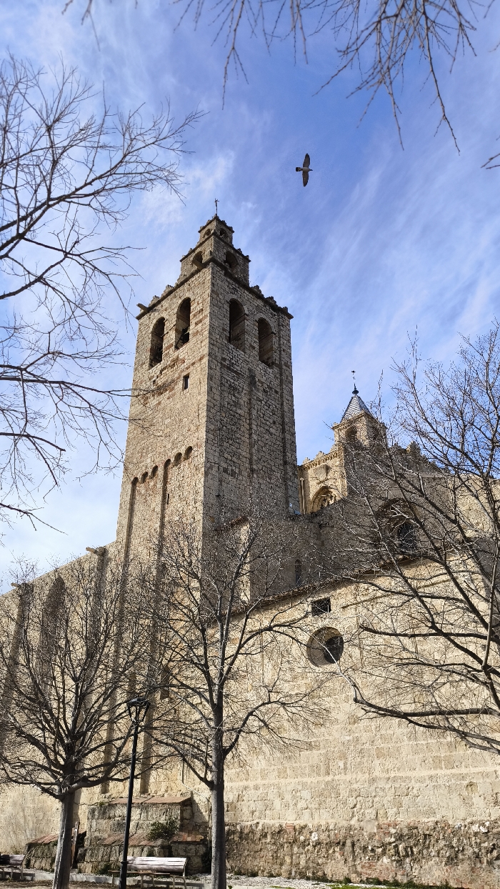 An image captures a low-angle view of the Monestir de Sant Cugat del Vallès, located in Sant Cugat del Vallès, Spain, under a clear blue sky with scattered white cirrus clouds