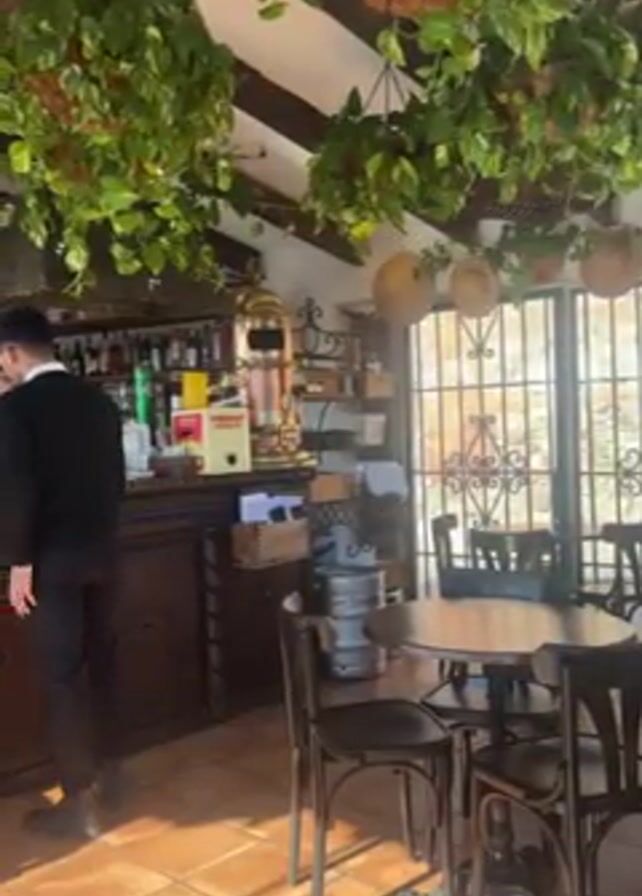 interior of a restaurant or bar. Two bartenders are standing behind a dark wood bar. One is serving a drink to an unseen customer. A vintage beer dispenser is visible on the bar top. Four small, round tables with black chairs are in the foreground. Large potted plants hang from the ceiling and adorn the windowsill. The floor is tiled with square terracotta tiles. A window with ornate iron bars is to the right of the bar. Sunlight streams into the room.