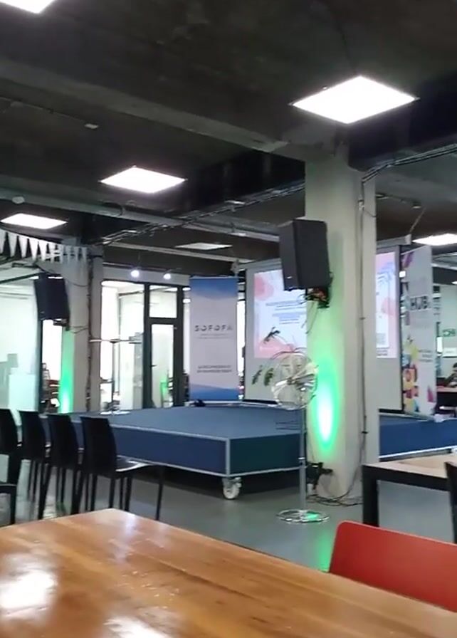 interior of a large, modern space that appears to be a co-working or event venue. The room has a raw, industrial feel with exposed concrete ceilings and visible ductwork. It is illuminated by square recessed lighting fixtures. In the foreground, there are several long wooden tables surrounded by black and orange chairs. A clear view to the back of the space reveals a raised platform stage, decorated with white bunting. A banner with "SOFOFA" is visible. There are also two large digital displays on either side of the stage. A man is seen on a ladder working on something near the ceiling. He is wearing dark clothing. The room appears mostly empty, but in the back, a person is seated at a table. A silver fan is also seen. The overall impression is that the space is being set up for an event.