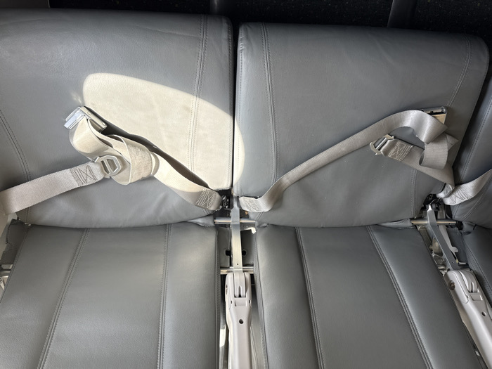The image displays the interior of a vehicle, consistent with a public transport bus or van, located in Tijuana, Mexico. Two adjacent, empty passenger seats are visible, upholstered in textured gray vinyl or leather. Each seat features a matching gray fabric lap belt with a silver-colored buckle mechanism, both unbuckled and resting on the seat cushions. The metal support frames of the seatbacks are partially exposed between the seats and at the base of the seatbacks. Sunlight illuminates the right seat cushion and the corresponding seatbelt, casting a bright spot and indicating a nearby window to the right of the frame. No individuals or objects other than the vehicle's fixed components are present.