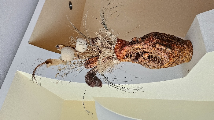 A textured, reddish-brown vase containing a dried floral arrangement is situated on a light-colored, angular architectural ledge. The vase features an organic, rough exterior with dark brown, bulbous protrusions. The arrangement comprises numerous thin, light-colored dried grasses, several spherical, cream-colored seed pods, and a few darker, irregularly shaped dried elements. The immediate background consists of interior architectural features, including sections of walls painted in light beige, light gray, and tan, exhibiting both curved and angular lines. A portion of a light gray ceiling with a single recessed spotlight is visible in the upper right quadrant of the image. The scene is located in Dobrich, Bulgaria.