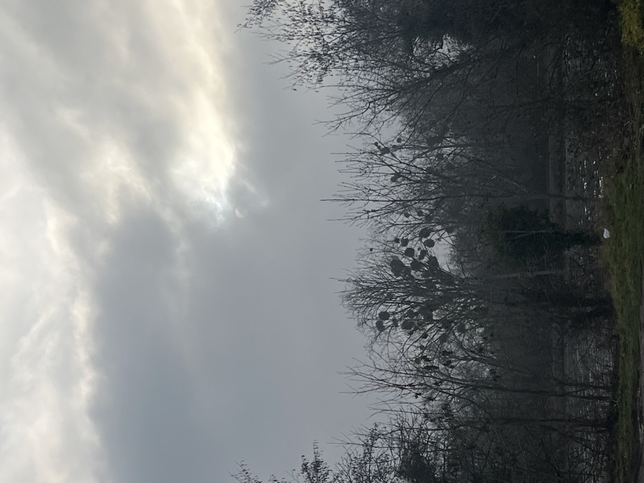 Overcast sky with sunlight trying to penetrate heavy clouds. Bare trees with clusters of mistletoe punctuate the right side of the frame. A hint of green vegetation is present at the bottom right corner, suggesting a roadside or field. The overall scene evokes a sense of winter or early spring.