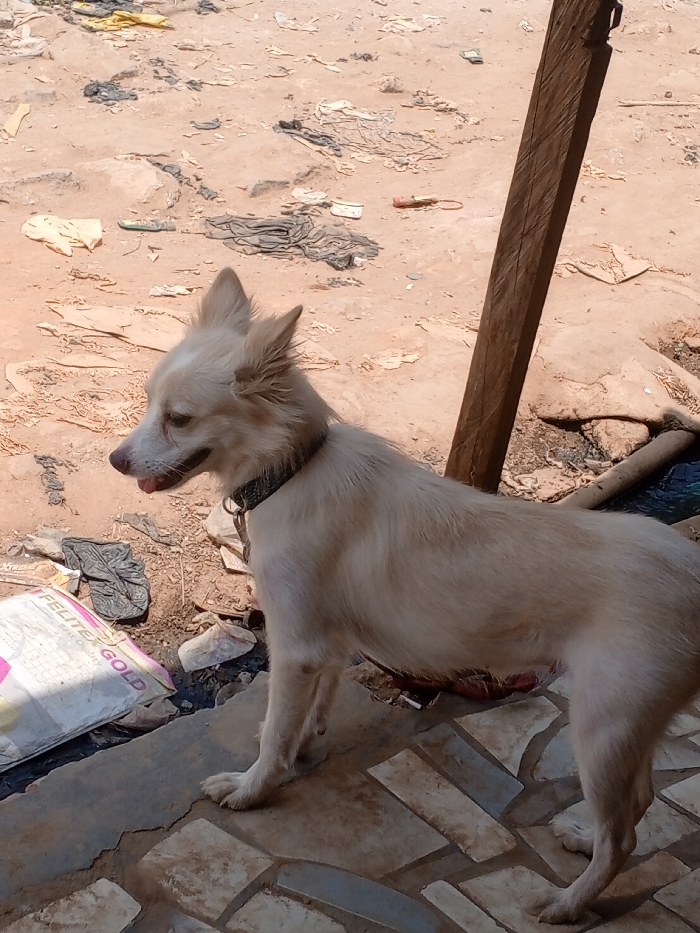 - "A medium-sized dog with light-colored fur and a dark collar stands with its front paws on a grey and brown tiled surface" by FM-7QInq1, licensed under CC BY 4.0